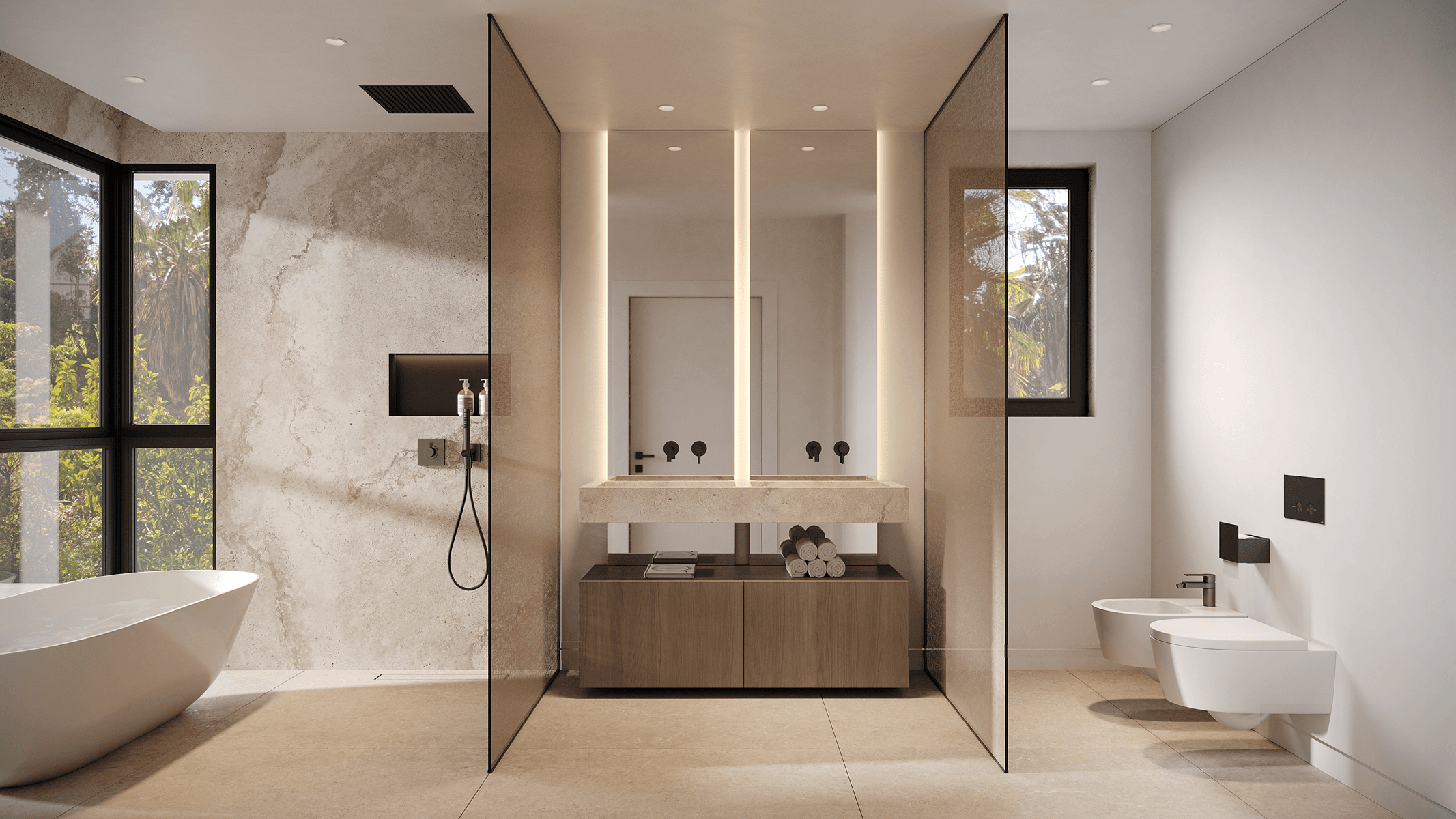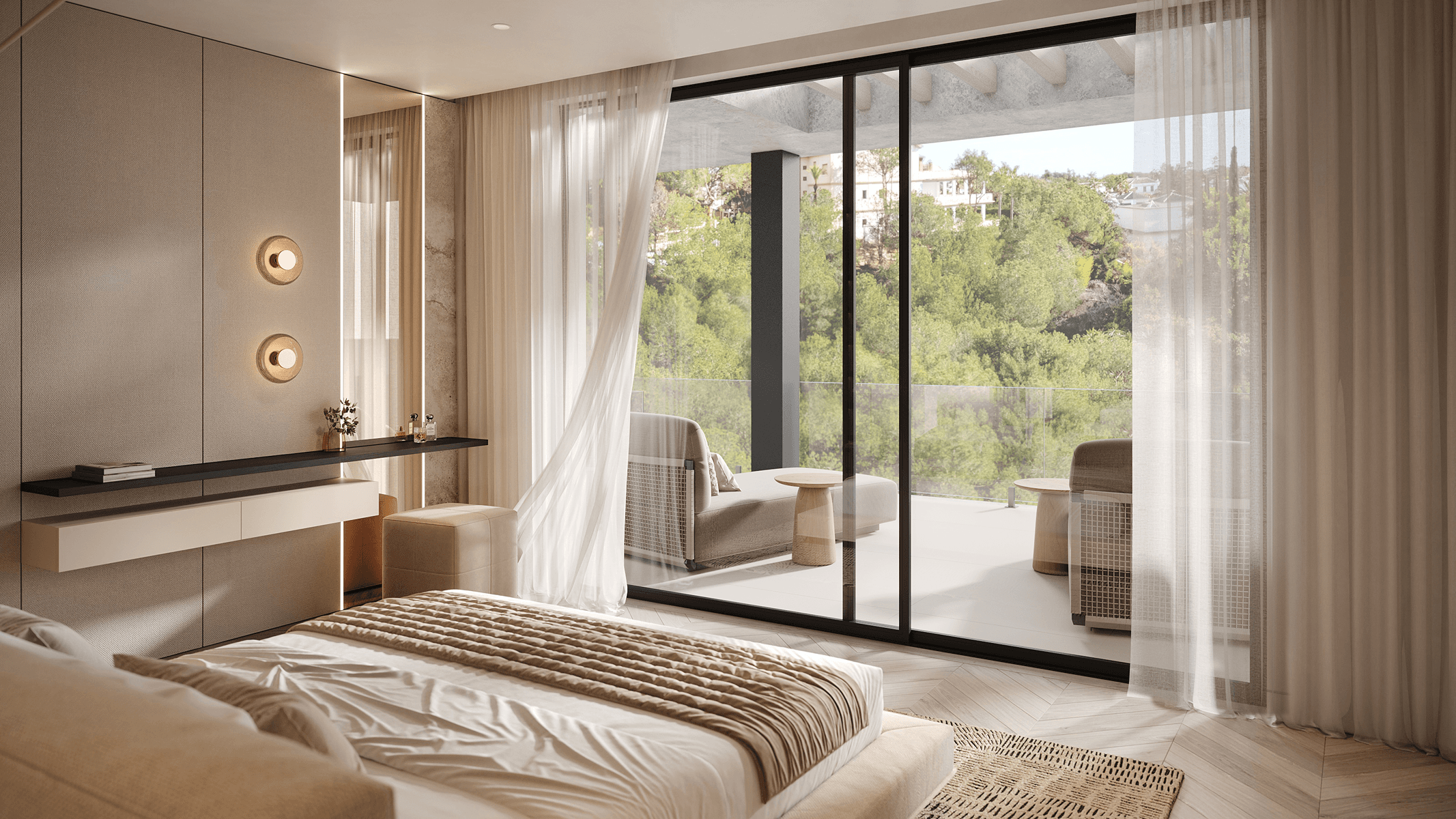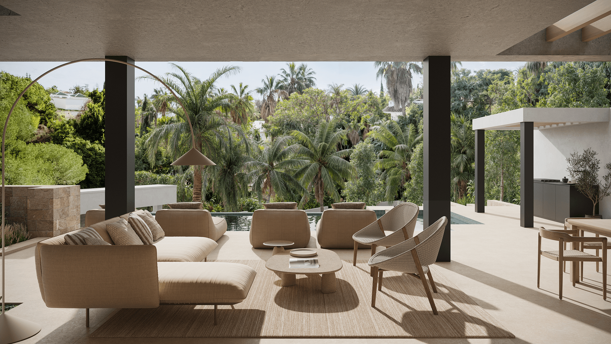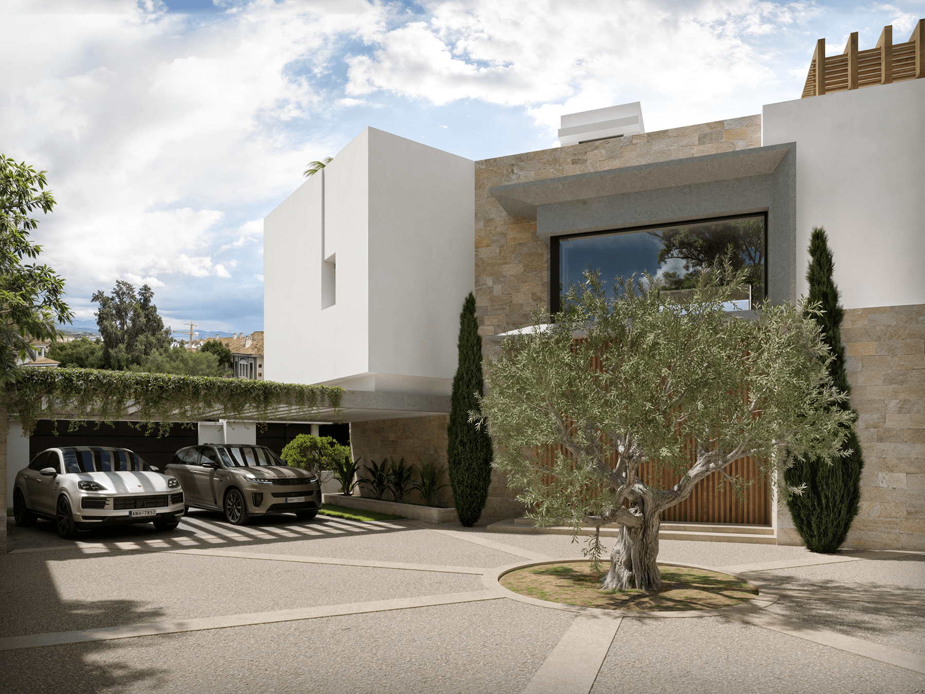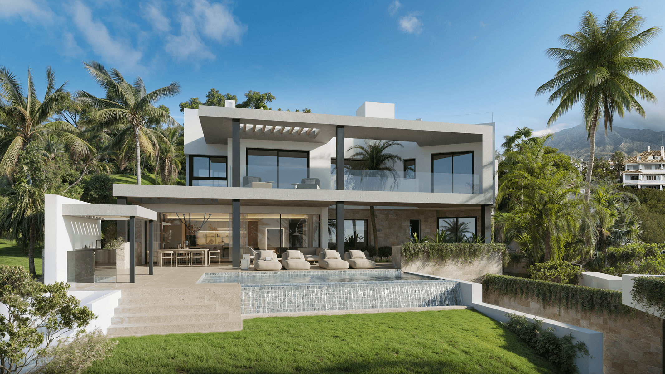 On the main floor, there is a light-filled entrance hall, an open concept living and dining room with a bioethanol fireplace that brings warmth and modernity, as well as an elegant kitchen with island, preparation area, and laundry room. From here, there is access to a terrace with a pool and outdoor views, ideal for moments of relaxation and socialization. The upper floor houses the master suite and two additional bedrooms, each with a private bathroom, dressing rooms, and access to sunny terraces that invite you to enjoy the Mediterranean climate. On the lower floor, there is a private garage, gym, cellar, living room, and all the facilities for guests, offering a complete space for leisure and comfort. Read more